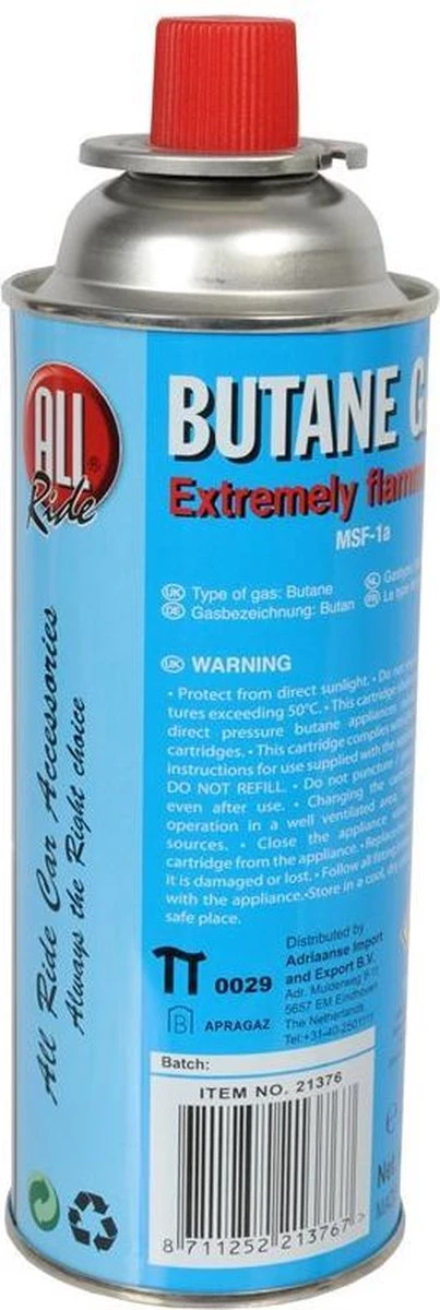 Gasbus van het merk All-ride gevuld met butaan. Wegwerp fles, niet geschikt voor navullen. Standaard aansluiting welke past op kooktoestellen en onkruidbranders